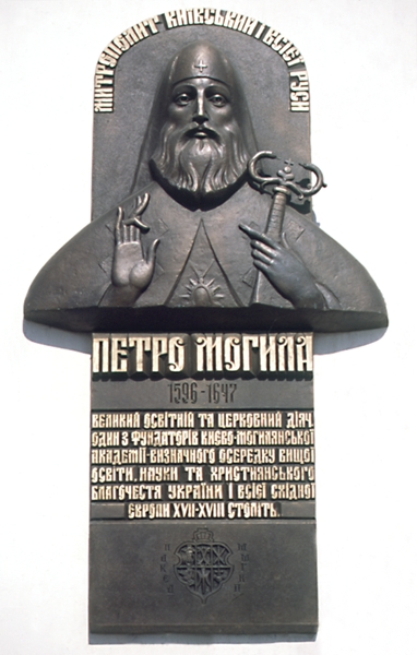 Memorial plaque to 17th-century Metropolitan Petro Mohyla, installed on the facade of the University of "Kyiv-Mohyla Academy" //